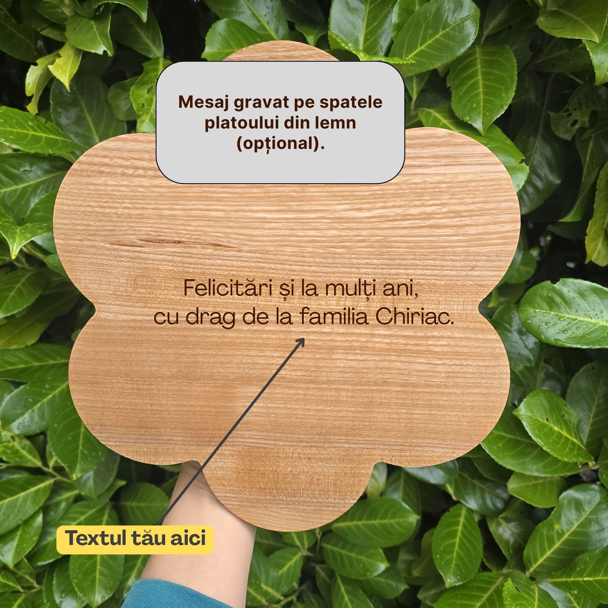 Puteți adăuga un nume, o dată sau un mesaj scurt, gravate pe față sau pe spate (opțional). Completați câmpul de personalizare sau scrieți-ne pentru cereri speciale – vă ajutăm cu drag!