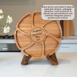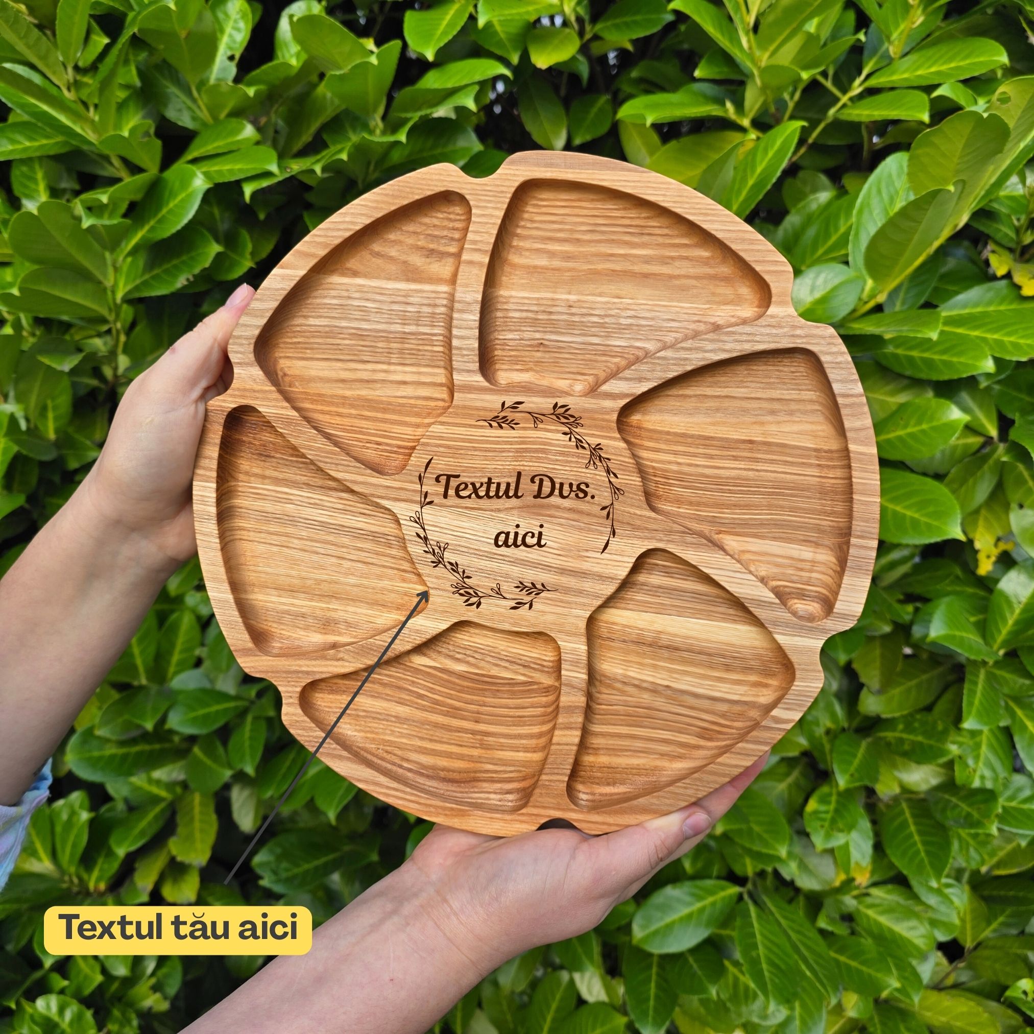 Platou Floare din lemn de frasin – lucrat manual și finisat cu ulei alimentar, sigur pentru contactul cu alimentele. Ideal pentru brânzeturi și cașcaval, aperitive sau mezeluri, cu design elegant și compartimente practice.