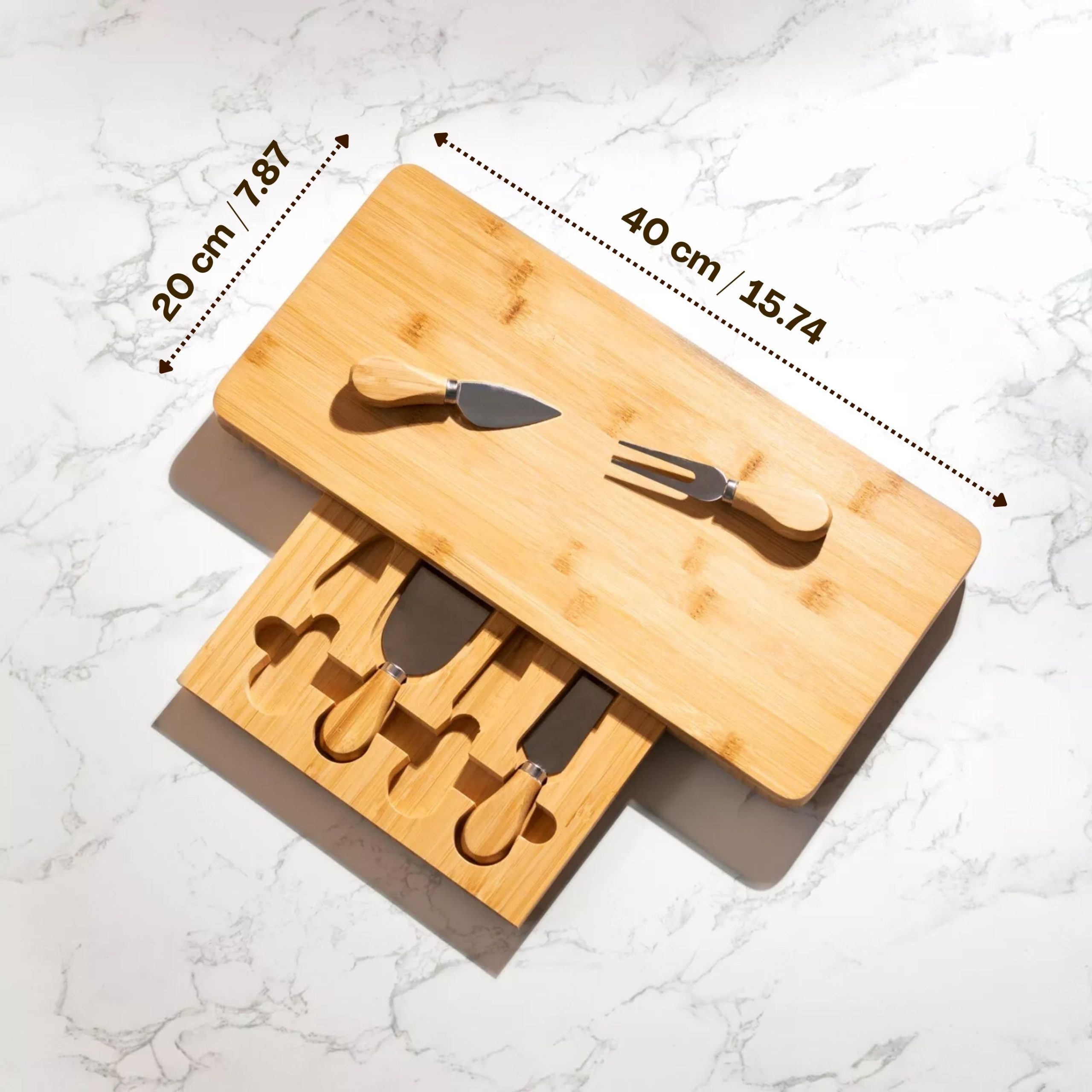 Realizat din lemn de bambus durabil și ecologic, acest platou este piesa centrală ideală pentru orice masă festivă. Designul său inteligent include un sertar culisant ascuns, unde sunt păstrate cele 4 accesorii din oțel inoxidabil cu mânere din bambus, special concepute pentru tăierea și servirea diferitelor tipuri de brânzeturi.