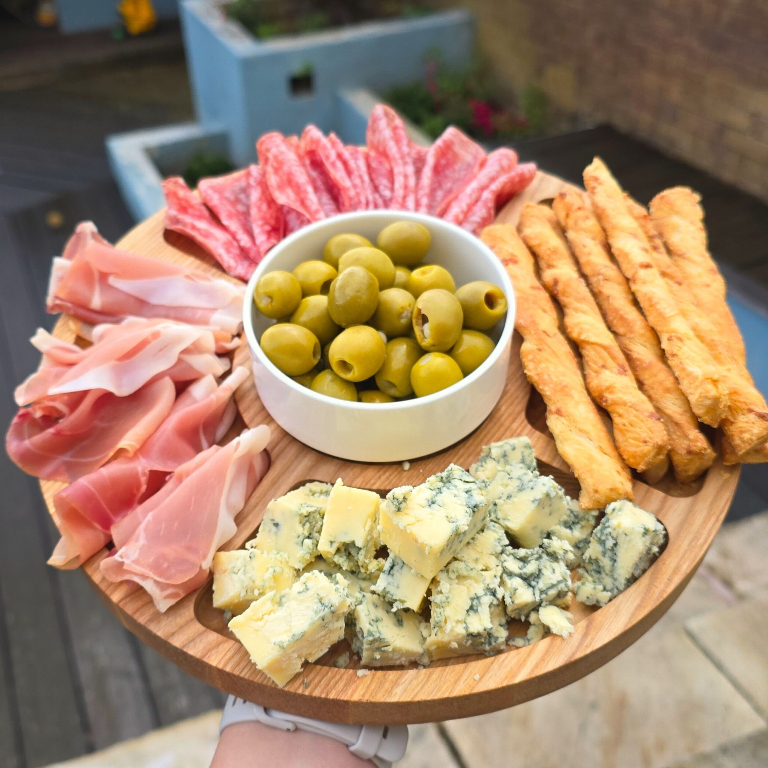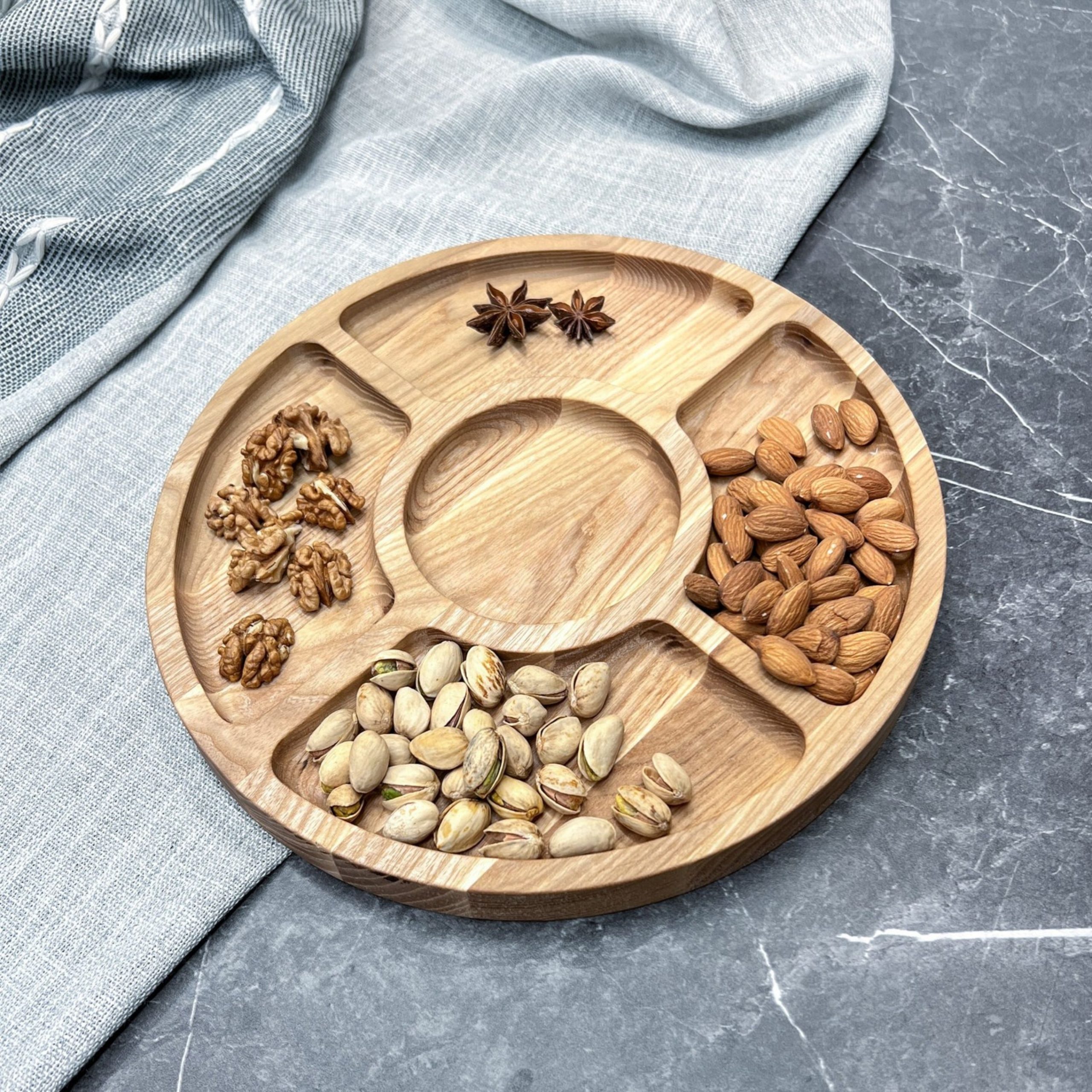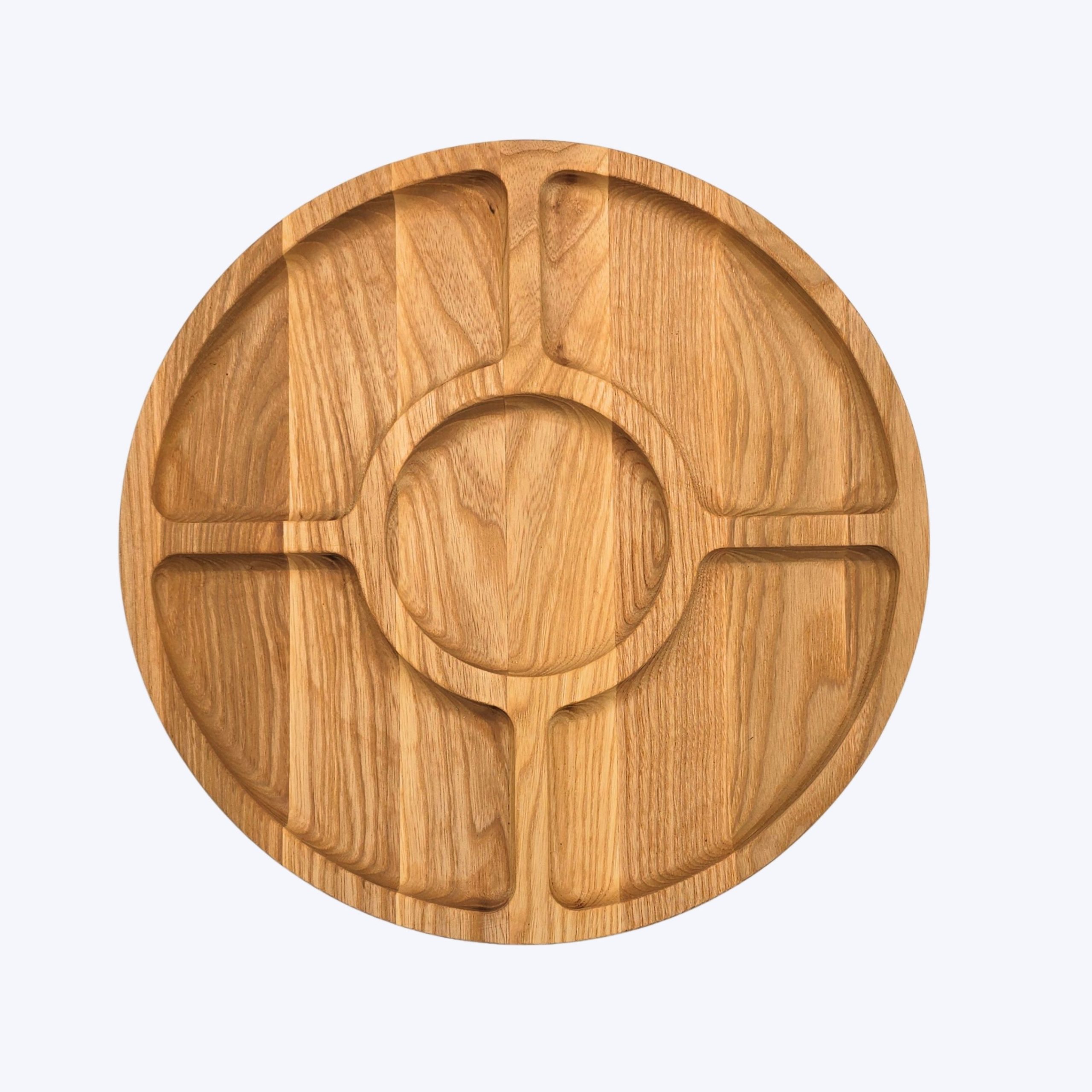 Platou rotund din lemn de frasin – lucrat manual și finisat cu ulei alimentar, sigur pentru contactul cu alimentele. Ideal pentru brânzeturi și cașcaval, aperitive sau mezeluri, cu design elegant și compartimente practice.
