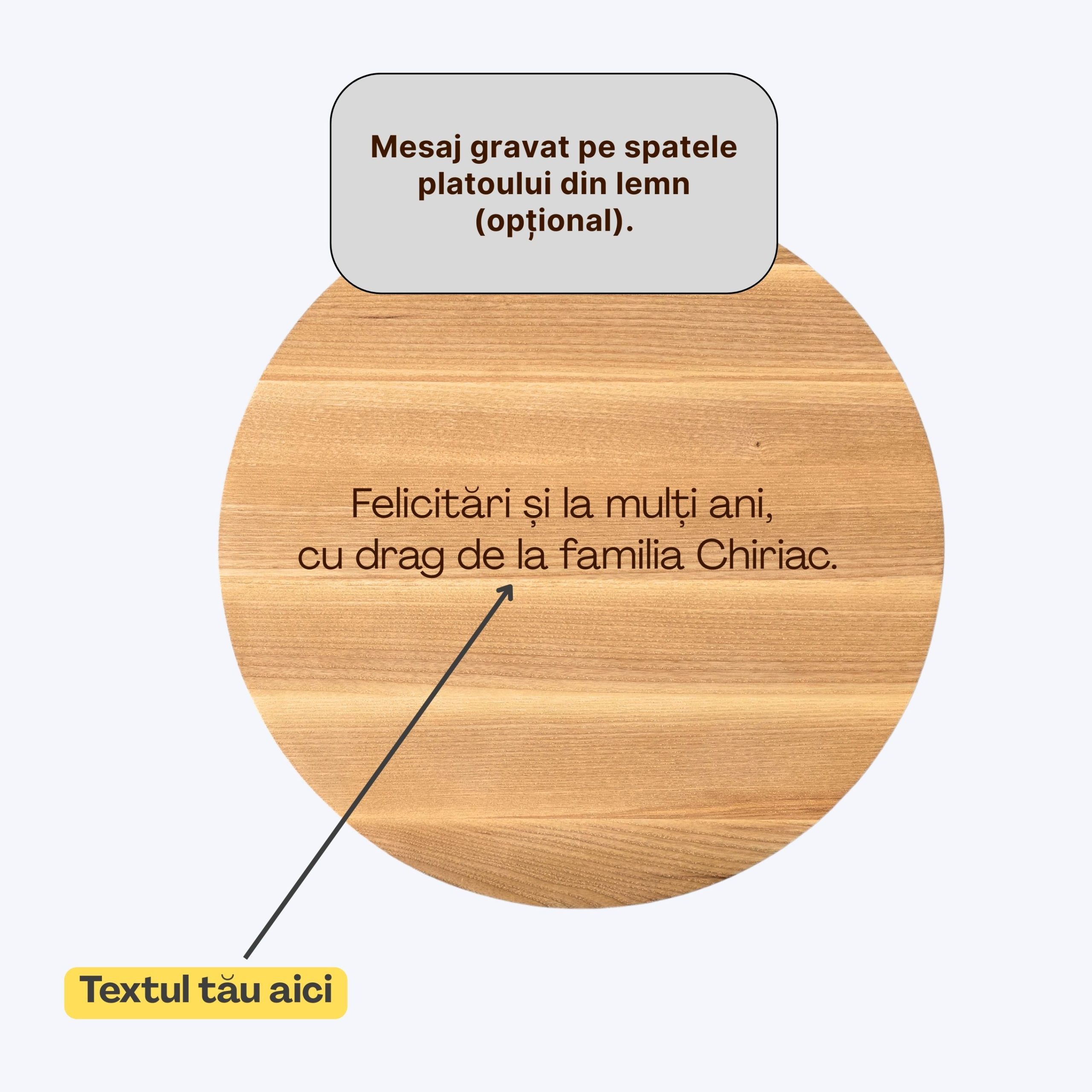 Puteți adăuga un nume, mesaj scurt sau dată, gravate pe față sau pe spate (opțional). Completați câmpul de personalizare sau scrieți-ne pentru cereri speciale – vă ajutăm cu drag!