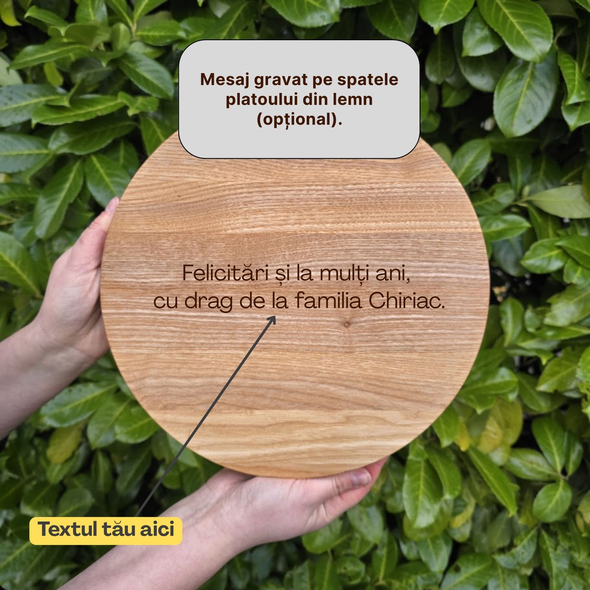 Puteți adăuga un nume, mesaj scurt sau dată, gravate pe față sau pe spate (opțional). Completați câmpul de personalizare sau scrieți-ne pentru cereri speciale – vă ajutăm cu drag!