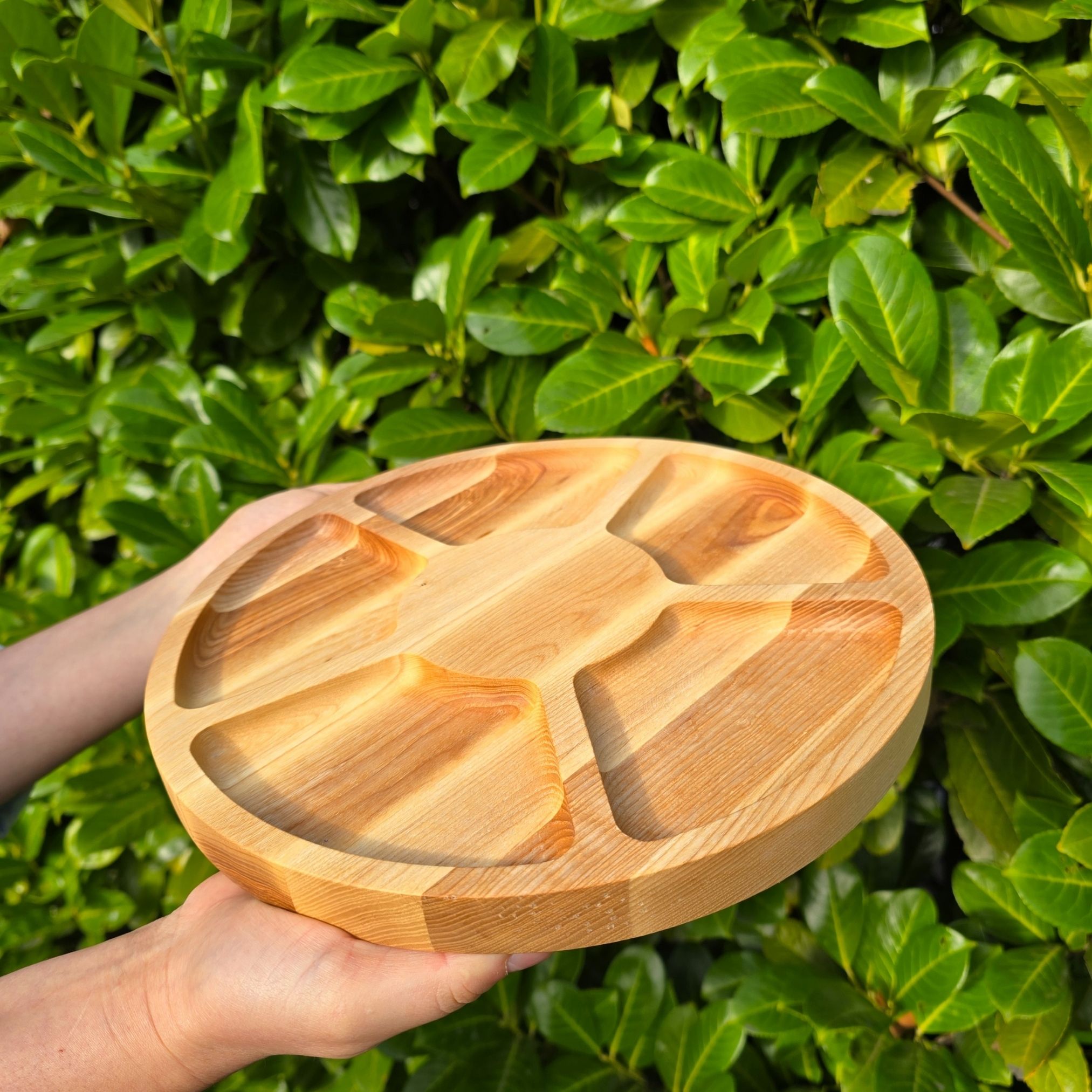 Platou rotund din lemn de frasin – lucrat manual și finisat cu ulei alimentar, sigur pentru contactul cu alimentele. Ideal pentru brânzeturi și cașcaval, aperitive sau mezeluri, cu design elegant și compartimente practice.
