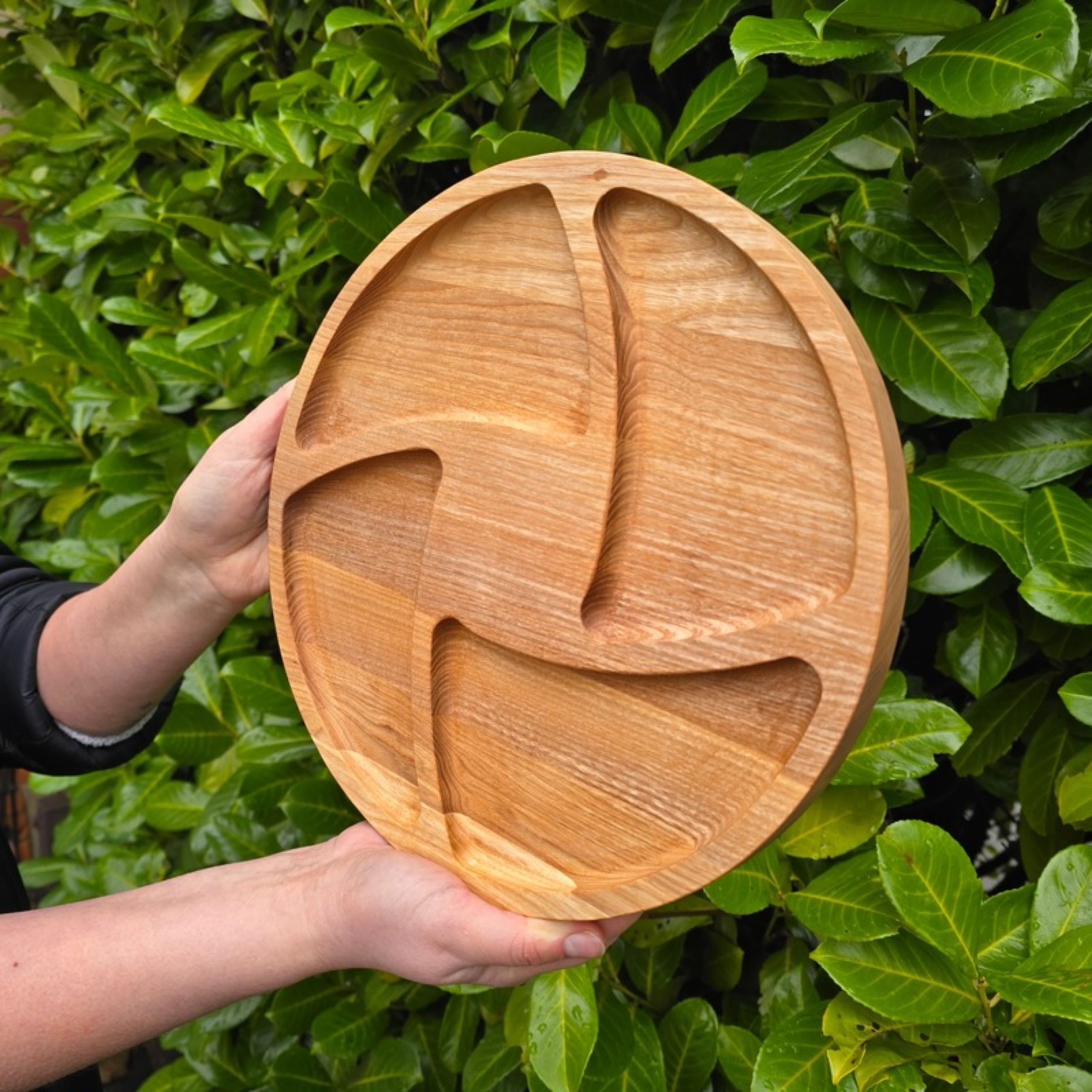 Platou rotund din lemn de frasin – lucrat manual și finisat cu ulei alimentar, sigur pentru contactul cu alimentele. Ideal pentru brânzeturi și cașcaval, aperitive sau mezeluri, cu design elegant și compartimente practice.