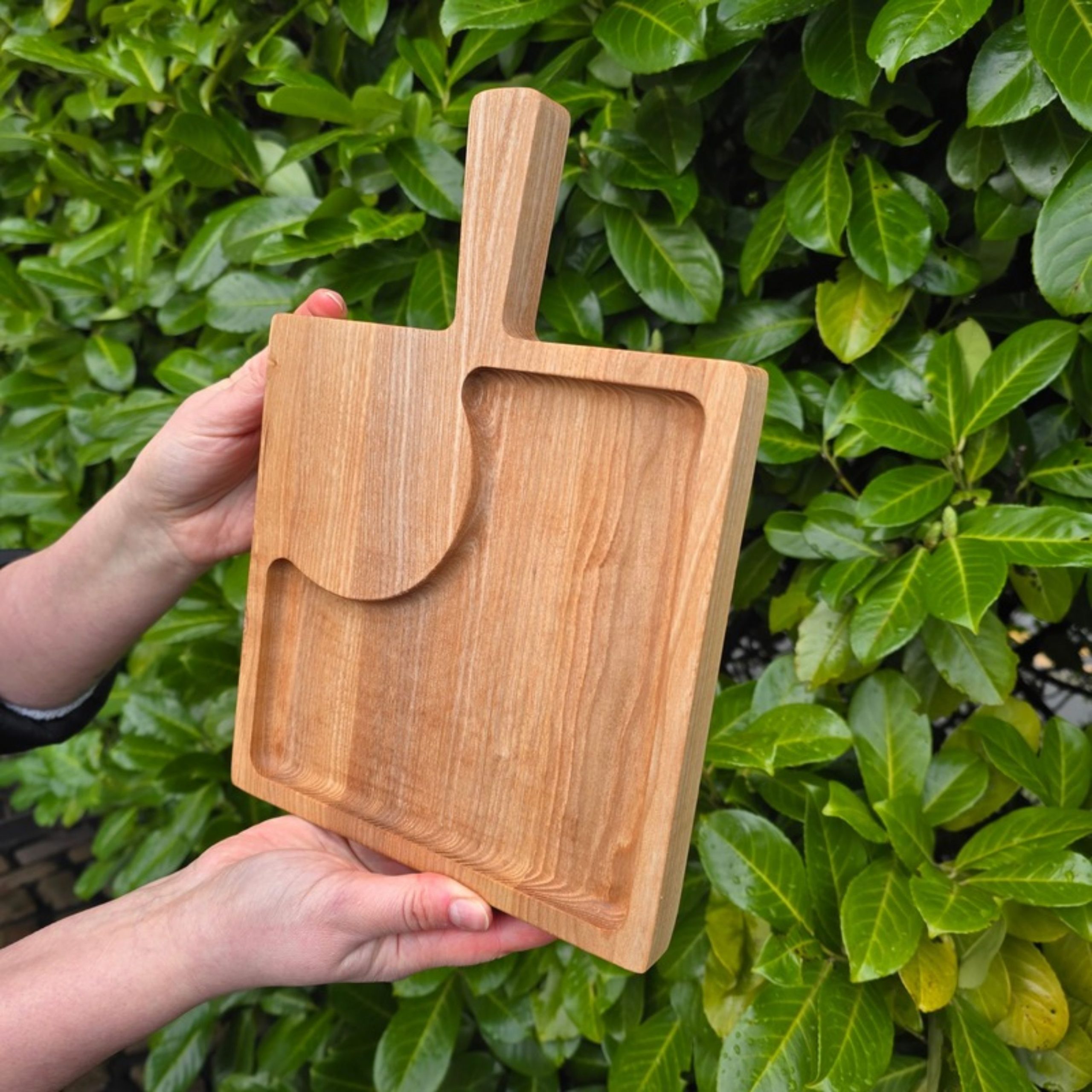 Platou Pătrat din lemn de frasin – lucrat manual și finisat cu ulei alimentar, sigur pentru contactul cu alimentele. Ideal pentru brânzeturi și cașcaval, aperitive sau mezeluri, cu design elegant și compartimente practice.